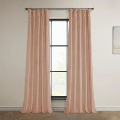 Light Control: This lined curtain panel is considered Room Darkening, blocking anywhere from 75-80% of the light. Darker colors will always block more of the light while lighter colors let more of the light through. How To Hang: Our header allows you to hang 3 ways. Curtain panels can be sheered on a rod using the pocket, Hang with back tabs Or attached to rings using the belt and drapery pins. Pole Pocket will accommodate a pole up to 1.5 inches, Hooks Not Included. What You Get: Once purchased you will receive ONE PANEL (1), measuring 50 inches (127 cm) wide by 108 inches (274.32 cm) in length. Each panel will be individually bagged to preserve the fabric quality. See below for the measuring guide. Color & Texture: This Peach Blossom Color with Velvet Texture is a perfect choice for your home decor. This weighted hem curtain is lined and backed with smooth off-white fabric. Keep It Clean: The curtains should be dry cleaned only. Fold lines can be steamed out using a iron or garment steamer. Avoid making contact with the face fabric.