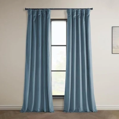 Light Control: This lined curtain panel is considered Room Darkening, blocking anywhere from 75-80% of the light. Darker colors will always block more of the light while lighter colors let more of the light through. How To Hang: Our header allows you to hang 3 ways. Curtain panels can be sheered on a rod using the pocket, Hang with back tabs Or attached to rings using the belt and drapery pins. Pole Pocket will accommodate a pole up to 1.5 inches, Hooks Not Included. What You Get: Once purchased you will receive ONE PANEL (1), measuring 50 inches (127 cm) wide by 96 inches (243.84 cm) in length. Each panel will be individually bagged to preserve the fabric quality. See below for the measuring guide. Color & Texture: This Denmark Blue Color with Velvet Texture is a perfect choice for your home decor. This weighted hem curtain is lined and backed with smooth off-white fabric. Keep It Clean: The curtains should be dry cleaned only. Fold lines can be steamed out using a iron or garment steamer. Avoid making contact with the face fabric.