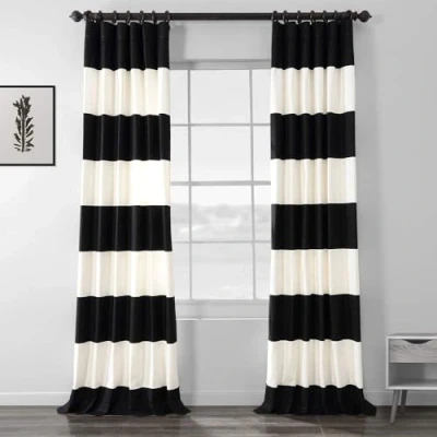 What You Get: Once purchased you will receive ONE PANEL (1), measuring 50 inches (127 cm) wide by 108 inches (274.32 cm) in length. Each panel will be individually bagged to preserve the fabric quality. Choose the right curtain length with our Measuring Guide, See below. Light Control: This lined curtain panel is considered Room Darkening, blocking anywhere from 75-94.9% of the light. Darker colors will always block more of the light while lighter colors let more of the light through. Color & Texture: This Onyx Black & Off White color is a perfect choice for your home decor. This curtain is lined and is backed with smooth off-white fabric. Keep It Clean: The curtains should be dry cleaned only. Fold lines can be steamed out using a iron or garment steamer. Avoid making contact with the face fabric..Sold Per Panel.100% Cotton | Lined.3" Pole Pocket with Hook Belt & Back Tabs.Base Fabric- Off White | Stripe Color(s)- 10 inch Stripe, Black and Off White.Dry Clean Only International products have separate terms, are sold from abroad and may differ from local products, including fit, age ratings, and language of product, labeling or instructions.