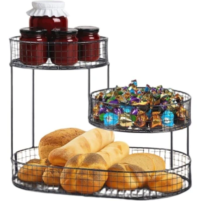 General description This spacious 3-tier metal fruit basket is designed to store fruits, vegetables, snacks, and bread efficiently. Its open design promotes air circulation, keeping produce fresher for longer while saving valuable countertop space. Made from durable, food-compliant iron, this fruit bowl rack can withstand heavy loads without bending, making it perfect for everyday use in kitchens, pantries, or restaurants. Technical specifications Material: Food-compliant iron Design: 3-tier wire structure Rust-proof Usage This versatile basket can be used to store a variety of items, including: Fruits (apples, bananas, etc.) Vegetables (potatoes, onions, etc.) Snacks and bread Eggs, cupcakes, coffee bags, toiletries, or toys Other information This metal fruit rack adds a touch of modern farmhouse style to your kitchen and complements various decor styles, including rustic, modern, or vintage. It is also suitable for use as a finishing touch for weddings and holidays. The fruit stand