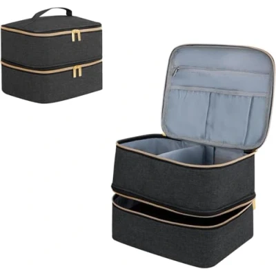 【DOUBLE-LAYER NAIL POLISH CASE WITH AMPLE STORAGE】This organiser features two main compartments. The secure bottom layer stores up to 30 nail polish bottles, while the top section fits your UV lamp and larger tools. Multiple zippered pockets keep all your manicure accessories neatly organised and easily accessible. 【COMPACT & PORTABLE NAIL BAG FOR TRAVEL】Designed for mobility, this lightweight case comes with a sturdy top handle for easy carrying. Its compact size fits effortlessly into luggage, making it the perfect nail kit storage solution for professional technicians on the go or for home use. 【DURABLE & SCRATCH-RESISTANT NYLON CONSTRUCTION】Crafted from high-quality, tear-resistant nylon fabric, this nail bag is built to last. The smooth, rust-resistant double zippers ensure effortless access, while the soft interior lining protects your valuable polishes and tools from damage. 【VERSATILE MULTI-PURPOSE COSMETIC ORGANISER】Beyond a nail polish case, this bag brilliantly stores makeup, brushes, skincare, and essential oils. Its sleek, professional design makes it a practical and stylish storage solution for any beauty enthusiast's vanity or salon station. 【VERSATILE MULTI-PURPOSE COSMETIC ORGANISER】Beyond a nail polish case, this bag brilliantly stores makeup, brushes, skincare, and essential oils. Its sleek, professional design makes it a practical and stylish storage solution for any beauty enthusiast's vanity or salon station.