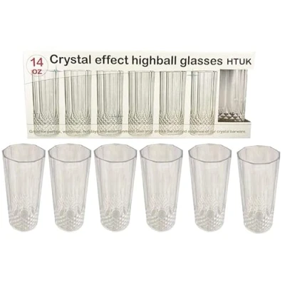 HTUK Long Drink Glasses 6pk Clear Crystal Effect Plastic Highball Tumblers Reusable 14oz/400ml approx