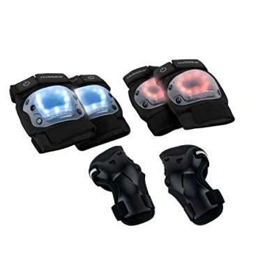 HUDORA Children's and Adult Protector Set, Size M, Optimal Visibility on Skates, Scooters, MTB Thanks to 11 LED Lights, Includes Elbow Pads, Knee Pads Wrist Guards, Black, M