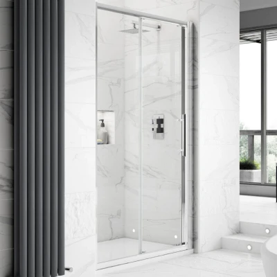 General description Hudson Reed Apex Sliding Shower Door is designed to fit openings between 1145mm and 1190mm, providing a sleek and modern solution for your bathroom. Made from toughened 8mm glass, it ensures safety and durability while offering a minimalist aesthetic with its polished chrome frame and T-bar handle. The door features a patented EasyFit system for straightforward installation and is equipped with quick release bottom rollers for easy cleaning. Technical specifications Shower Door Type: Sliding Width: 1190mm Height: 1900mm Glass Thickness: 8mm Glass Finish: Clear Frame Finish: Polished Chrome Weight: 49.8 Kg Minimum Adjustment: 1145mm Maximum Adjustment: 1190mm Entry Width: 480mm Compatibility and accessories Extension Profile recommended for increased adjustment when used with a side panel Shower Tray, Waste, and Side Panel sold separately Installation Extra care must be taken during installation to avoid damaging the fittings Installation should follow the