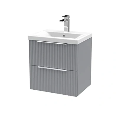 Hudson Reed DFF292A Fluted Modern Bathroom Wall Hung 2 Drawer Vanity Basin Unit with Mid Edge Ceramic Basin, 500mm, Satin Grey