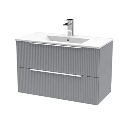 Hudson Reed DFF295B Fluted Modern Bathroom Wall Hung 2 Drawer Vanity Basin Unit with Minimalist Ceramic Basin, 800mm, Satin Grey