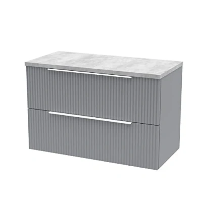 Hudson Reed DFF295LBG Fluted Modern Bathroom Wall Hung 2 Drawer Vanity Unit with Bellato Grey Laminate Worktop, 800mm, Satin