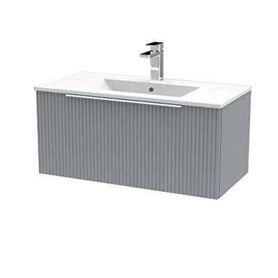Hudson Reed DFF296B Fluted Modern Bathroom Wall Hung 1 Drawer Vanity Basin Unit with Minimalist Ceramic Basin, 800mm, Satin Grey