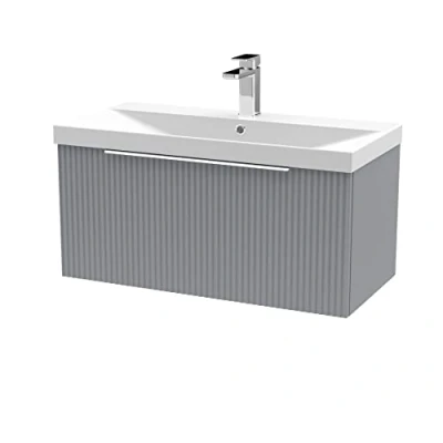 Hudson Reed DFF296D Fluted Modern Bathroom Wall Hung 1 Drawer Vanity Basin Unit with Thin Edge Ceramic Basin, 800mm, Satin Grey
