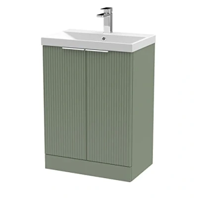 Hudson Reed DFF825D Fluted Modern Bathroom Floor Standing 2 Door Vanity Basin Unit with Thin Edge Ceramic Basin, 600mm, Satin Green