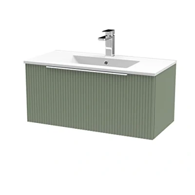 Hudson Reed DFF896B Fluted Modern Bathroom Wall Hung 1 Drawer Vanity Basin Unit with Minimalist Ceramic Basin, 800mm, Satin Green