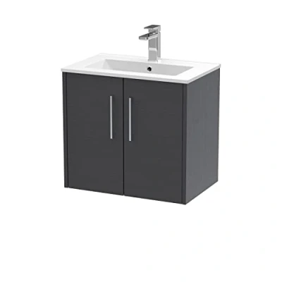 Hudson Reed JNU2223B Juno Modern Bathroom Wall Hung 2 Door Vanity with Minimalist Ceramic Basin, 600mm, Woodgrain Graphite Grey