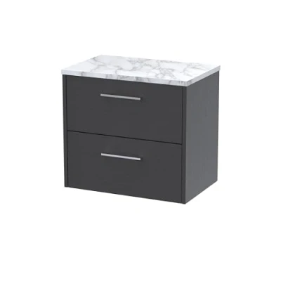 Hudson Reed Juno Wall Hung 2 Drawer Vanity Unit with Carrera Marble Worktop 600mm Wide Graphite Grey Woodgrain
