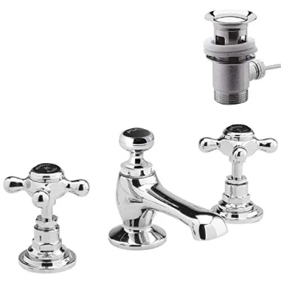 Hudson Reed Old London BC407HX Topaz Traditional Bathroom 3 Hole Basin Mixer Taps with Crosshead Handles and Hexagonal Collars Pop Up Waste, 94mm x 246mm, Chrome/Black, 3TH