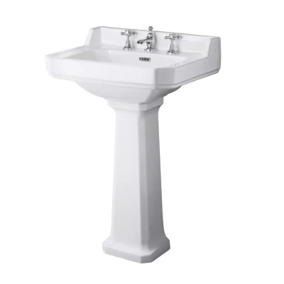 The Hudson Reed Richmond 600mm White 3 Tap Basin with Comfort Height Pedestal is perfect for Edwardian-style bathrooms. Its angular design adds elegance, while the comfort height pedestal suits taller individuals or those with mobility needs, maintaining a classic look. Made from vitreous China, it boasts a glossy white finish and is highly sanitary and durable. The non-porous surface resists bacteria, stains, scratches, and imperfections, making it easy to clean. It includes a splashback, basin overflow cover, and a 5-year guarantee. Note: fixings and bottle trap are not included. A slotted basin waste plug is required. Care during installation is essential to avoid damage. The manufacturer offers a 5-year guarantee against faulty workmanship or materials, excluding serviceable parts, if installed and maintained as per instructions.. Hudson Reed Richmond 600mm White 3 Tap Basin & Comfort Height Pedestal Porcelain
