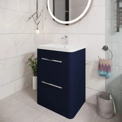 From Hudson Reed's Solar furniture range, this floor standing cabinet with a polymarble basin coordinates sleek curved contours and matt Indigo Blue tones to create a contemporary and unique aesthetic for your bathroom. Made from a silky matt Medium Density Fibreboard (MDF) vinyl cabinet and a durable polymarble basin, this unit has excellent longevity and is incredibly hardwearing.The polymarble basin is especially resistant to staining and very easy to clean. As a perfect space-saving storage solution, this cabinet is available in a range of sizes to fit your bathroom needs and is ideal for a busy family bathroom when you need extra manoeuvrability. Featuring soft-close technology for the drawers, this cabinet decreases the risk of damage from daily wear and tear while providing a serene environment with quiet closing action.Features & Benefits: Hudson Reed Solar Indigo Blue 600mm 2-Drawer Free Standing Cabinet & Polymarble Basin, Waste shroud included, Soft-close drawers, Floor-standing and comes with a 5-year guaranteePlease note: , Fixings are not included., During installation, you must take extra care to avoid damaging the fittings. The manufacturer provides a 5-year guarantee against faulty workmanship or materials (excluding serviceable parts), providing they have been installed, cared for, and used according to the instructions.. Hudson Reed Solar Indigo Blue 600mm 2-Drawer Free Standing Cabinet & Polymarble Basin