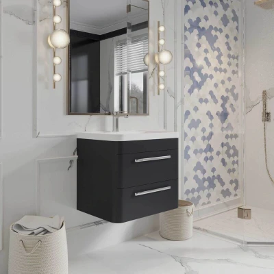While creating the illusion of a bigger bathroom, this wall hung cabinet offers additional storage space for all your toiletries. Combining a sleek Indigo Blue matt surface and modern curved contours, this cabinet and polymarble basin offer excellent functionality with a contemporary design as an ideal feature for your bathroom.This polymarble basin maintains a durable glossiness and is resistant to tarnishing with minimal porosity making it easy to sanitise. This Medium Density Fibreboard (MDF) vinyl cabinet has commendable strength and robustness with chrome covered D-shape handles for shiny and non-corrosive finishing touches to the fitting. Including soft-close features for the drawers, this cabinet ensures a quieter environment within your bathroom with a reduced risk of damage from daily wear and tear.Features & Benefits: Hudson Reed Solar Indigo Blue 600mm 2-Drawer Wall Hung Cabinet & Polymarble Basin, Soft-close drawers, Fixings and waste shroud included, Saves room and makes your bathroom look spacious, and comes with a 5-year guaranteePlease note: , During installation, you must take extra care to avoid damaging the fittings. The manufacturer provides a 5-year guarantee against faulty workmanship or materials (excluding serviceable parts), providing they have been installed, cared for, and used according to the instructions.. Hudson Reed Solar Indigo Blue 600mm 2-Drawer Wall Hung Cabinet & Polymarble Basin
