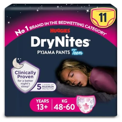 DISCREET, UNDERWEAR-LIKE FIT: DryNites bedwetting pants are designed to look and feel like real underwear with a low waistband that hides smoothly under pyjamas, while quiet materials help reduce rustling under clothes EXTRA ABSORBENT: Gender-specific designs with absorbency tailored to your child's anatomy featuring 5 layers of protection for dependable overnight dryness—more absorbent than regular nappies or training pants FUN, AGE-APPROPRIATE DESIGNS: Sizes 3–4 and 4–7 feature Disney designs to make bedtime more enjoyable; older sizes 8–13 teen and 13+ use simple, discreet prints that look like real underwear to boost self confidence SOFT AND COMFORTABLE: Made from super soft materials that mould to your child’s body and features stretchy sides for underwear-like feel and support during sleep to ensure comfortable, dry, and restful night's sleep CONVENIENT JUMBO PACK SIZE: Includes 11 pants for teen girls with cute yet simple designs, providing a quick stock up, perfect for travel so you’re always prepared for bedtime routines and quick changes
