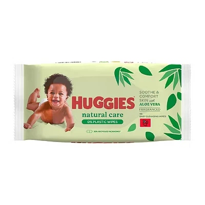 Why Buy Me? Huggies Natural Care Baby Wipes are designed to protect and comfort your baby’s delicate skin from day one. With a 0% plastic formula and 100% naturally derived fibres, these wipes are kind to both skin and the environment. Enriched with Aloe Vera and Vitamin E, they help to moisturise, nourish and soothe the skin. Approved by the British Skin Foundation, hypoallergenic and dermatologically tested, they are a safe and trusted choice. Gentle yet effective for cleaning hands, face and bottoms, they are an everyday essential for parents. Brand: Huggies Product Type: Wipes Product Sub-type: Baby Wipes Details: • Ingredients: Made with 0% plastic and 100% naturally derived fibres, gentle on skin and environmentally friendly. • Enriched Formula: Infused with Aloe Vera and Vitamin E to moisturise, soothe and nourish your baby’s skin. • Skin Balance: Helps maintain the skin’s pH level, reducing the main causes of nappy rash. • Hypoallergenic: Fragrance-free, hypoallergenic formula, safe for sensitive skin. • Dermatological Approval: Clinically tested and approved by the British Skin Foundation. • Gentle Cleaning: Suitable for hands, face and bottoms, providing gentle yet effective cleaning with every use. • Age Range: Safe to use from birth (0+). • Pack Size: 48 wipes, ideal for everyday use.