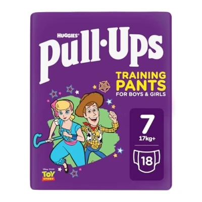 AmazonThe unique 'feel wet' layer in Pull-Ups day-time training pants helps Big Kids ‘know when they need to go'. These nappies are designed as pull ups to help your toddler feel like a big kid. With a wetness indicator that will fade when wet to teach your potty trainer the difference between wet and dry. Now available for boys and girls in a unisex pack. Featuring your big kid's favourite Toy Story characters. With a super soft and stretchy 360˚ waistband, watch as they start practising pulling their pants up and down by themselves in no time. Pull-Ups are designed to fit and feel like real underwear and feature fun Disney Toy Story graphics so your Big Kid looks as good as they feel.