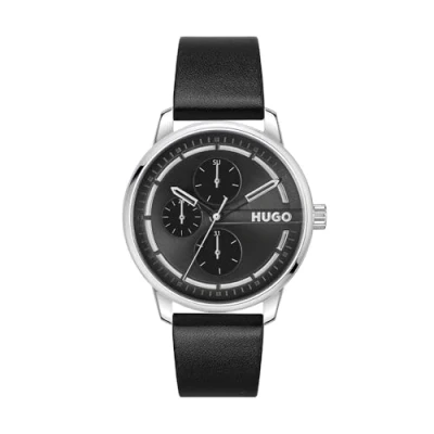 HUGO Analogue Multifunction Quartz Watch for Men #STAMP MULTI Collection with Leather Strap or Stainless Steel Bracelet,black