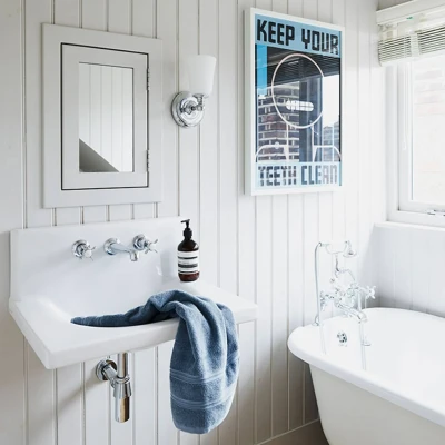 One-bulb bathroom wall light Huguenot Lake The wall light Huguenot Lake provides atmospheric additional lighting in every bathroom. Due to the IP code IP44, it is protected against the ingress of spray water from all sides and is, therefore, wonderfully suited for use as mirror lighting. Its design appears very timeless and elegant with the brilliantly white glass lampshade and the polished chrome-plated wall mount, and it can be integrated into a number of interior design styles.
