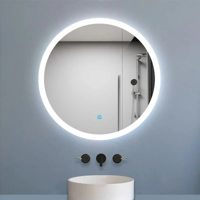 General description Modern round bathroom mirror designed for wall mounting, featuring integrated LED lights and a demister pad. This illuminated mirror provides a clear reflection with a cool white light, making it ideal for grooming tasks. The mirror is constructed with durable, safety glass and is designed to withstand the humid environment of a bathroom. Technical specifications Dimensions: 600x600x40mm (WidthxHeightxDepth) Weight: 3.92kg LED Light Color Temperature: 6000K (Cool White) Width of Light Strip: 30mm IP Rating: IP44 Installation Can be hung vertically or horizontally due to 4 holes in the backboard. Usage Single touch control system for easy operation of LED light and demister pad. Demister pad ensures a steam-free reflection for clear visibility. Other information Advanced technology used to prevent blackening of mirror edges. Clear definition glass for optimal clarity during makeup and shaving.