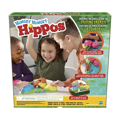 Hasbro Hungry Hungry Hippos Game 285 F8815. Popular board game game for children. A great choice for families. A fun gift for birthdays and Christmas. Plastic cover keeps marbles from rolling out. 2 to 4 player game. Suitable for ages 4 and more.