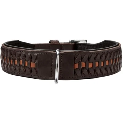 Hand-woven dog collar made from high-quality cowhide leather The artistic braiding makes the collar look particularly elegant The leather used is durable and easy to clean Please note: this leather may lead to slight discolouration Size: length 35 - 42 cm, width 4 cm, made in Germany