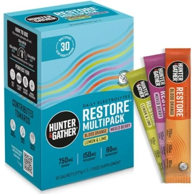 🌊 HYDRATE SMARTER WITH NATURE’S BEST ELECTROLYTES - Stay sharp, strong and switched on with Hunter & Gather Restore Electrolytes. These sugar-free electrolyte powder sachets are made with earth-derived minerals to support hydration, performance and mental clarity. Each sachet delivers 750mg sodium, 150mg potassium and 80mg marine magnesium to replenish the essential minerals lost through daily life, exercise or fasting. 🍓 FRESH & FRUITY OR SERIOUSLY SALTY - Choose from lightly sweetened Mixed Berry, Lemon & Lime or Blood Orange, naturally flavoured for a clean taste without sugar or artificial sweeteners. Prefer it pure? Our Unflavoured Restore is seriously salty and completely free from sweeteners or flavourings. It’s also the only version suitable for those following a fasting lifestyle. 🧪 SCIENTIFICALLY FORMULATED - Each Restore Electrolytes sachet contains:🧂750mg Sodium (from Pink Himalayan Salt) 🍌150mg Potassium (Natural Potash Salt) 🌊80mg Magnesium (from Marine Source) No fillers, no artificial additives, just the essential minerals your body needs to thrive. 💧 EASY, ON-THE-GO HYDRATION - Just tear, pour and stir. Whether you’re recovering post-exercise, replenishing after sleep, or powering through a busy day, Restore Electrolytes makes staying hydrated simple. Adjust flavour intensity to your liking by mixing with more or less water. 💪 WHY NATURAL SALT MATTERS - Your body needs salt to conduct nerve impulses, move muscles and maintain fluid balance. Thanks to modern diets and depleted soil, many of us don’t get enough. That’s why we use Pink Himalayan Rock Salt, which is naturally rich in trace minerals and free from chemical processing.