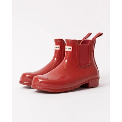 Womens Original Chelsea Gloss Boot Ready for rain, each Hunter Chelsea Boot is handcrafted from natural rubber and vulcanised for superior protection before having the high gloss finish applied. Retaining the iconic features of the traditional Chelsea, it features an elasticated-gussets and has a nylon pull tab make for easy wear. The Hunter Original tread pattern and comfortable 100% recycled polyester lining completes the design on this 100% waterproof boot. Natural Rubber With Gloss Finish Upper Hunter Original Calendared Rubber Outsole Handcrafted Elasticated Gusset And Pull Tab For Ease Of Foot Entry U - 5% Elastic + 95% Rubber L - 100% Recycled Polyester O - 100% Rubber Use Boot Shine and Rubber Boot Buffer WFS2078RGL