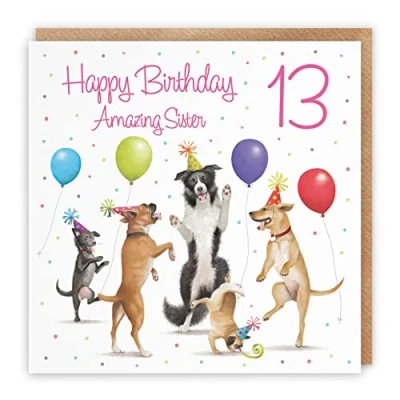 Hunts England 13th Sister Birthday Card - Dancing Dogs - Happy Birthday - Amazing Sister - Age 13 - Girl's 13th Birthday Card For Sister BIRTHDAY CARD - Make that birthday memorable by wishing them special birthday wishes with our birthday card CARD MEASURES 148 x 148 mm - The artistic greetings card is printed on medium-weight paper stock. The card also comes with an envelope which measures 155 x 155 mm in size PRINTED MESSAGE INSIDE - The greetings card has a message printed inside it which makes your card that extra special whilst also leaving you plenty of room to write your own special message. Please see the inside image of the card to see the printed message RESPONSIBLY SOURCED PAPER STOCK - The greetings card is printed on responsibly sourced paper stock giving you peace of mind that the card has been made with the sustainability of our precious forests in mind