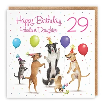 Hunts England ⭐️ - 29th Daughter Birthday Card - Dancing Dogs - Happy Birthday - Fabulous Daughter - Age 29 - Women's 29th Birthday Card For Daughter - Milo's Gallery Collection - Age Twenty Nine CARD MEASURES 148 x 148 mm 🌟 - The artistic dogs birthday card is printed on medium-weight paper stock. The card comes with an envelope which measures 155 x 155 mm in size PRINTED MESSAGE INSIDE 💫 - The birthday card has a message printed inside it which makes your card even more special whilst still leaving you plenty of room to write your own special message. Please see the inside image of the card to see the printed message RESPONSIBLY SOURCED PAPER STOCK 🌳 - The greetings card is printed on responsibly sourced paper stock giving you peace of mind that the card has been made with the sustainability of our precious forests in mind BY HUNTS ENGLAND 🇬🇧 - This dancing dogs birthday card is part of our stunning Milo’s Gallery Collection