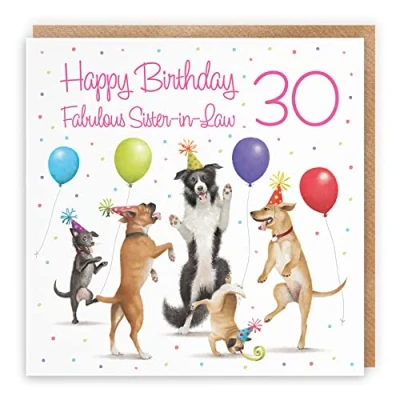 Hunts England ⭐️ - 30th Sister-in-Law Birthday Card - Dancing Dogs - Fabulous Sister-in-Law - Age 30 - Women's 30th Birthday Card For Sister-in-Law - Milo's Gallery - Age Thirty CARD MEASURES 148 x 148 mm 🌟 - The artistic dogs birthday card is printed on medium-weight paper stock. The card comes with an envelope which measures 155 x 155 mm in size PRINTED MESSAGE INSIDE 💫 - The birthday card has a message printed inside it which makes your card even more special whilst still leaving you plenty of room to write your own special message. Please see the inside image of the card to see the printed message RESPONSIBLY SOURCED PAPER STOCK 🌳 - The greetings card is printed on responsibly sourced paper stock giving you peace of mind that the card has been made with the sustainability of our precious forests in mind BY HUNTS ENGLAND 🇬🇧 - This dancing dogs birthday card is part of our stunning Milo’s Gallery Collection