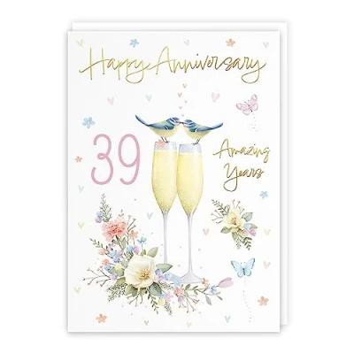 Hunts England ⭐️ - 39th Anniversary Card For Him Or Her - A5 Size - Champagne Flutes - Gold Foil - 39th Anniversary Card For Couples, Partner, Husband, Wife, etc. - Milo's Gallery CARD MEASURES 148 x 210 mm 🌟 - The A5 size anniversary card features gold foil. It is printed on medium-weight paper stock. The card comes with a white envelope PRINTED MESSAGE INSIDE 💫 - The champagne flutes anniversary card has a beautiful design and message printed inside it which makes your card even more special whilst still leaving you plenty of room to write your own message. Please see the inside image of the card to see the printed message RESPONSIBLY SOURCED PAPER STOCK 🌳 - The greetings card is printed on responsibly sourced paper stock giving you peace of mind that the card has been made with the sustainability of our precious forests in mind BY HUNTS ENGLAND 🇬🇧 - This anniversary card is part of our Milo's Gallery Collection