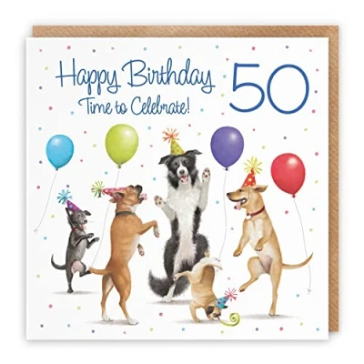 Hunts England 50th Birthday Card For Him / Her - Dancing Dogs - Men's / Women's Birthday Card - Age 50 Male Birthday Card - Age 50 Female Birthday Card BIRTHDAY CARD - Make that birthday memorable by wishing them special birthday wishes with our birthday card. Our beautifully designed artistic birthday card is perfect for family relations such as a mum, dad, husband, wife, daughter, son, grandma, grandad, brother, sister, stepdad, stepmum, grandpa, granny, auntie, uncle, cousin, mother-in-law, father-in-law, brother-in-law, sister-in-law, or for friends or work colleagues, etc. CARD MEASURES 148 x 148 mm - The artistic greetings card is printed on medium-weight paper stock. The card also comes with an envelope which measures 155 x 155 mm in size PRINTED MESSAGE INSIDE - The greetings card has a message printed inside it which makes your card that extra special whilst also leaving you plenty of room to write your own special message. Please see the inside image of the card to see the printed message RESPONSIBLY SOURCED PAPER STOCK - The greetings card is printed on responsibly sourced paper stock giving you peace of mind that the card has been made with the sustainability of our precious forests in mind