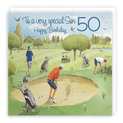 Hunts England ⭐️ - 50th Son Golfing Birthday Card - Age 50 Card For Son - 'Golf Bunker' - Milo's Gallery Collection - Age Fifty Birthday Card - Son Birthday Card - 50 Year Old Son Golfing Card CARD MEASURES 148 x 148 mm 🌟 - The artistic golf birthday card is printed on medium-weight paper stock. The card comes with a white envelope which measures 155 x 155 mm in size PRINTED MESSAGE INSIDE 💫 - The greetings card has a message printed inside it which makes your card even more special whilst still leaving you plenty of room to write your own special message. Please see the inside image of the card to see the printed message RESPONSIBLY SOURCED PAPER STOCK 🌳 - The greetings card is printed on responsibly sourced paper stock giving you peace of mind that the card has been made with the sustainability of our precious forests in mind BY HUNTS ENGLAND 🇬🇧 - This golfing card is part of our stunning Milo’s Gallery Collection