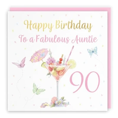 90th Auntie Pink Cocktail And Butterflies Birthday Card - Gold Foil - Milo's Gallery - Age 90 Drinks, Flowers, Hearts Elegant Birthday Card For Auntie - Age Ninety CARD MEASURES 148 x 148 mm - The fun pink cocktail and butterflies flowery card is printed on medium-weight paper stock. The card has a foil finish with the wording "Happy Birthday" in gold foil and comes with a pink envelope which measures 155 x 155 mm in size PRINTED MESSAGE INSIDE - The greetings card has a message printed inside it which makes your card even more special whilst still leaving you plenty of room to write your own special message. Please see the inside image of the card to see the printed message RESPONSIBLY SOURCED PAPER STOCK - The greetings card is printed on responsibly sourced paper stock giving you peace of mind that the card has been made with the sustainability of our precious forests in mind BY HUNTS ENGLAND - This women's card featuring pretty hearts and flowers is part of our stunning Milo’s Gallery Collection and is perfect for a cocktail drinks lover