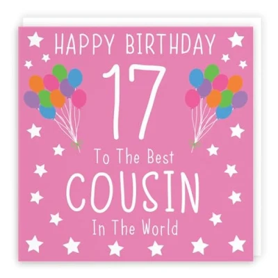 Hunts England ⭐️ - Cousin 17th Female Pink Birthday Card - Happy Birthday - 17 - To The Best Cousin In The World - Iconic Collection - Fun Colourful Card CARD MEASURES 148 x 148 mm 🌟 - The greetings card is printed on medium-weight paper stock. The card comes with an envelope which measures 155 x 155 mm in size LEFT BLANK INSIDE 💫 - The greetings card is left blank inside for your own special message RESPONSIBLY SOURCED PAPER STOCK 🌳 - The greetings card is printed on responsibly sourced paper stock giving you peace of mind that the card has been made with the sustainability of our precious forests in mind BY HUNTS ENGLAND 🇬🇧 - This card is by the independent publisher Hunts England who specialise in greetings cards and gift wrap