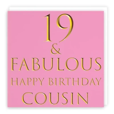 Hunts England ⭐️ - Cousin 19th Female Birthday Card - 19 & Fabulous - Happy Birthday Cousin - Still Totally Fabulous Collection (please note that the gold colour is printed effect, it is not foil) - Fun Female Card CARD MEASURES 148 x 148 mm 🌟 - The greetings card is printed on medium-weight paper stock. The card comes with an envelope which measures 155 x 155 mm in size LEFT BLANK INSIDE 💫 - The greetings card is left blank inside for your own special message RESPONSIBLY SOURCED PAPER STOCK 🌳 - The greetings card is printed on responsibly sourced paper stock giving you peace of mind that the card has been made with the sustainability of our precious forests in mind BY HUNTS ENGLAND 🇬🇧 - This card is by the independent publisher Hunts England who specialise in greetings cards and gift wrap