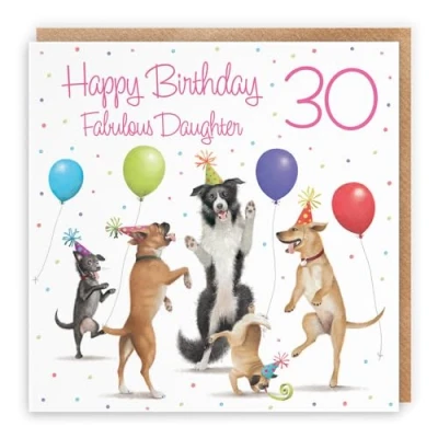 Hunts England ⭐️ - Large 30th Daughter Birthday Card - Dancing Dogs - Happy Birthday - Fabulous Daughter - Age 30 - Women's 30th Birthday Card For Daughter - Milo's Gallery - Funny Card - 210 x 210 mm LARGE CARD MEASURES 210 x 210 mm 🌟 - The greetings card is printed on medium-weight paper stock. The card comes with an envelope PRINTED MESSAGE INSIDE 💫 - The greetings card has a message printed inside it which makes your card even more special whilst still leaving you plenty of room to write your own message. Please see the inside image of the card to see the printed message RESPONSIBLY SOURCED PAPER STOCK 🌳 - The greetings card is printed on responsibly sourced paper stock giving you peace of mind that the card has been made with the sustainability of our precious forests in mind BY HUNTS ENGLAND 🇬🇧 - This card is by the independent publisher Hunts England who specialise in greetings cards and gift wrap