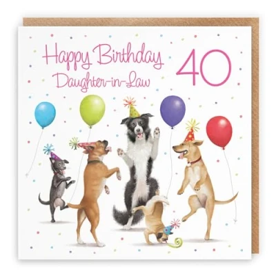 Hunts England ⭐️ - Large 40th Daughter-in-Law Birthday Card - Dancing Dogs - Daughter-in-Law - Age 40 - Funny Women's 40th Birthday Card For Daughter-in-Law - Milo's Gallery Collection - 210 x 210 mm LARGE CARD MEASURES 210 x 210 mm 🌟 - The greetings card is printed on medium-weight paper stock. The card comes with an envelope PRINTED MESSAGE INSIDE 💫 - The greetings card has a message printed inside it which makes your card even more special whilst still leaving you plenty of room to write your own message. Please see the inside image of the card to see the printed message RESPONSIBLY SOURCED PAPER STOCK 🌳 - The greetings card is printed on responsibly sourced paper stock giving you peace of mind that the card has been made with the sustainability of our precious forests in mind BY HUNTS ENGLAND 🇬🇧 - This card is by the independent publisher Hunts England who specialise in greetings cards and gift wrap