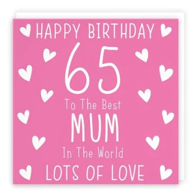 Hunts England ⭐️ - Mum 65th Birthday Card - Happy Birthday - 65 - To The Best Mum In The World - Lots Of Love - Iconic Collection CARD MEASURES 148 x 148 mm 🌟 - The greetings card is printed on medium-weight paper stock. The card comes with an envelope which measures 155 x 155 mm in size LEFT BLANK INSIDE 💫 - The greetings card is left blank inside for your own special message RESPONSIBLY SOURCED PAPER STOCK 🌳 - The greetings card is printed on responsibly sourced paper stock giving you peace of mind that the card has been made with the sustainability of our precious forests in mind BY HUNTS ENGLAND 🇬🇧 - This card is by the independent publisher Hunts England who specialise in greetings cards and gift wrap