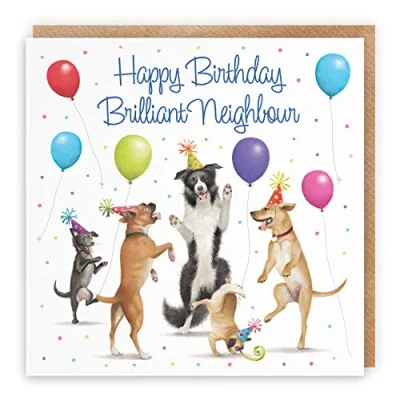 Hunts England ⭐️ - Neighbour Birthday Card - For Him / Her - Dancing Dogs - Happy Birthday - Brilliant Neighbour - Birthday Card For Neighbour - Milo's Gallery Collection CARD MEASURES 148 x 148 mm 🌟 - The artistic dogs birthday card is printed on medium-weight paper stock. The card comes with an envelope which measures 155 x 155 mm in size PRINTED MESSAGE INSIDE 💫 - The birthday card has a message printed inside it which makes your card even more special whilst still leaving you plenty of room to write your own special message. Please see the inside image of the card to see the printed message RESPONSIBLY SOURCED PAPER STOCK 🌳 - The greetings card is printed on responsibly sourced paper stock giving you peace of mind that the card has been made with the sustainability of our precious forests in mind BY HUNTS ENGLAND 🇬🇧 - This dancing dogs birthday card is part of our stunning Milo’s Gallery Collection