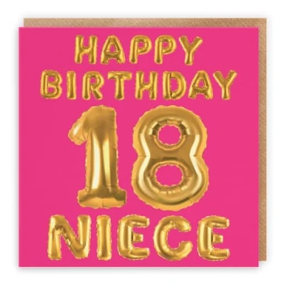 Hunts England ⭐️ - Niece 18th Birthday Card - Happy Birthday - 18 - Niece - Balloon Collection (please note that the gold colour is printed effect, it is not foil) CARD MEASURES 148 x 148 mm 🌟 - The greetings card is printed on medium-weight paper stock. The card comes with an envelope which measures 155 x 155 mm in size LEFT BLANK INSIDE 💫 - The greetings card is left blank inside for your own special message RESPONSIBLY SOURCED PAPER STOCK 🌳 - The greetings card is printed on responsibly sourced paper stock giving you peace of mind that the card has been made with the sustainability of our precious forests in mind BY HUNTS ENGLAND 🇬🇧 - This card is by the independent publisher Hunts England who specialise in greetings cards and gift wrap