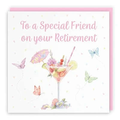 Pink Cocktail And Butterflies Elegant Retirement Card For Friend - Milo's Gallery - Drinks, Flowers, Hearts Friend Retirement Card - Retiring Card For Special Friend CARD MEASURES 148 x 148 mm - The fun pink cocktail and butterflies flowery card is printed on premium-quality paper stock giving it a thick and luxurious feel. The card comes with a premium-quality pink envelope which measures 155 x 155 mm in size PRINTED MESSAGE INSIDE - The greetings card has a message printed inside it which makes your card even more special whilst still leaving you plenty of room to write your own special message. Please see the inside image of the card to see the printed message RESPONSIBLY SOURCED PAPER STOCK - The greetings card is printed on responsibly sourced paper stock giving you peace of mind that the card has been made with the sustainability of our precious forests in mind BY HUNTS ENGLAND - This luxury women's card featuring pretty hearts and flowers is part of our stunning Milo’s Gallery Collection and is perfect for a cocktail drinks lover