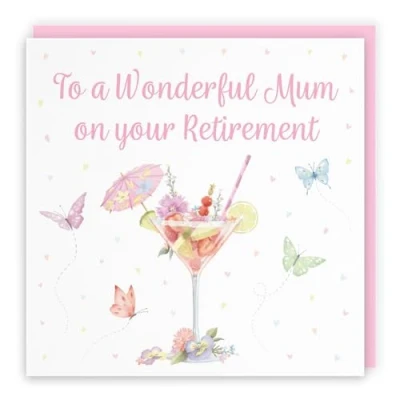 Pink Cocktail And Butterflies Elegant Retirement Card For Mum - Milo's Gallery - Drinks, Flowers, Hearts Mum Retirement Card - Retiring Card For Mum CARD MEASURES 148 x 148 mm - The fun pink cocktail and butterflies flowery card is printed on premium-quality paper stock giving it a thick and luxurious feel. The card comes with a premium-quality pink envelope which measures 155 x 155 mm in size PRINTED MESSAGE INSIDE - The greetings card has a message printed inside it which makes your card even more special whilst still leaving you plenty of room to write your own special message. Please see the inside image of the card to see the printed message RESPONSIBLY SOURCED PAPER STOCK - The greetings card is printed on responsibly sourced paper stock giving you peace of mind that the card has been made with the sustainability of our precious forests in mind BY HUNTS ENGLAND - This luxury women's card featuring pretty hearts and flowers is part of our stunning Milo’s Gallery Collection and is perfect for a cocktail drinks lover