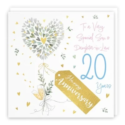 Son And Daughter-in-Law 20th Anniversary Card - 20 Years - Contemporary Hearts - Gold Foil - 20th Wedding Anniversary Card For Son And Daughter In Law CARD MEASURES 148 x 148 mm - The contemporary gold foiled anniversary card is printed on medium-weight paper stock. The card also comes with a white envelope which measures 155 x 155 mm in size PRINTED MESSAGE INSIDE - The greetings card has a message printed inside it which makes your card even more special whilst still leaving you plenty of room to write your own message. Please see the inside image of the card to see the printed message RESPONSIBLY SOURCED PAPER STOCK - The greetings card is printed on responsibly sourced paper stock giving you peace of mind that the card has been made with the sustainability of our precious forests in mind BY HUNTS ENGLAND - This anniversary card is part of our Milo's Gallery Collection and is printed in the United Kingdom