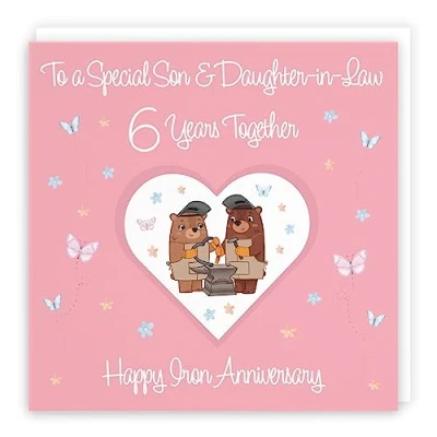 Hunts England ⭐️ - Son & Daughter-in-Law 6th Anniversary Card - 6 Years - Iron Anniversary - Romantic Meadows Collection - Sixth Anniversary Card For Son And Daughter-in-Law CARD MEASURES 148 x 148 mm 🌟 - The contemporary anniversary card is printed on medium-weight paper stock. The card also comes with a white envelope which measures 155 x 155 mm in size PRINTED MESSAGE INSIDE 💫 - The greetings card has a message printed inside it which makes your card even more special whilst still leaving you plenty of room to write your own message. Please see the inside image of the card to see the printed message RESPONSIBLY SOURCED PAPER STOCK 🌳 - The greetings card is printed on responsibly sourced paper stock giving you peace of mind that the card has been made with the sustainability of our precious forests in mind BY HUNTS ENGLAND 🇬🇧 - This anniversary card is part of our Romantic Meadows Collection