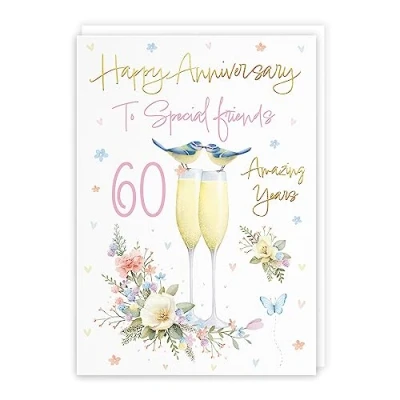 Hunts England ⭐️ - Special Friends 60th Anniversary Card - A5 Size - Champagne Flutes - Gold Foil - 60th Anniversary Card For Special Friends - 60 Years - Milo's Gallery CARD MEASURES 148 x 210 mm 🌟 - The A5 size anniversary card features gold foil. It is printed on medium-weight paper stock. The card comes with a white envelope PRINTED MESSAGE INSIDE 💫 - The champagne flutes anniversary card has a beautiful design and message printed inside it which makes your card even more special whilst still leaving you plenty of room to write your own message. Please see the inside image of the card to see the printed message RESPONSIBLY SOURCED PAPER STOCK 🌳 - The greetings card is printed on responsibly sourced paper stock giving you peace of mind that the card has been made with the sustainability of our precious forests in mind BY HUNTS ENGLAND 🇬🇧 - This anniversary card is part of our Milo's Gallery Collection